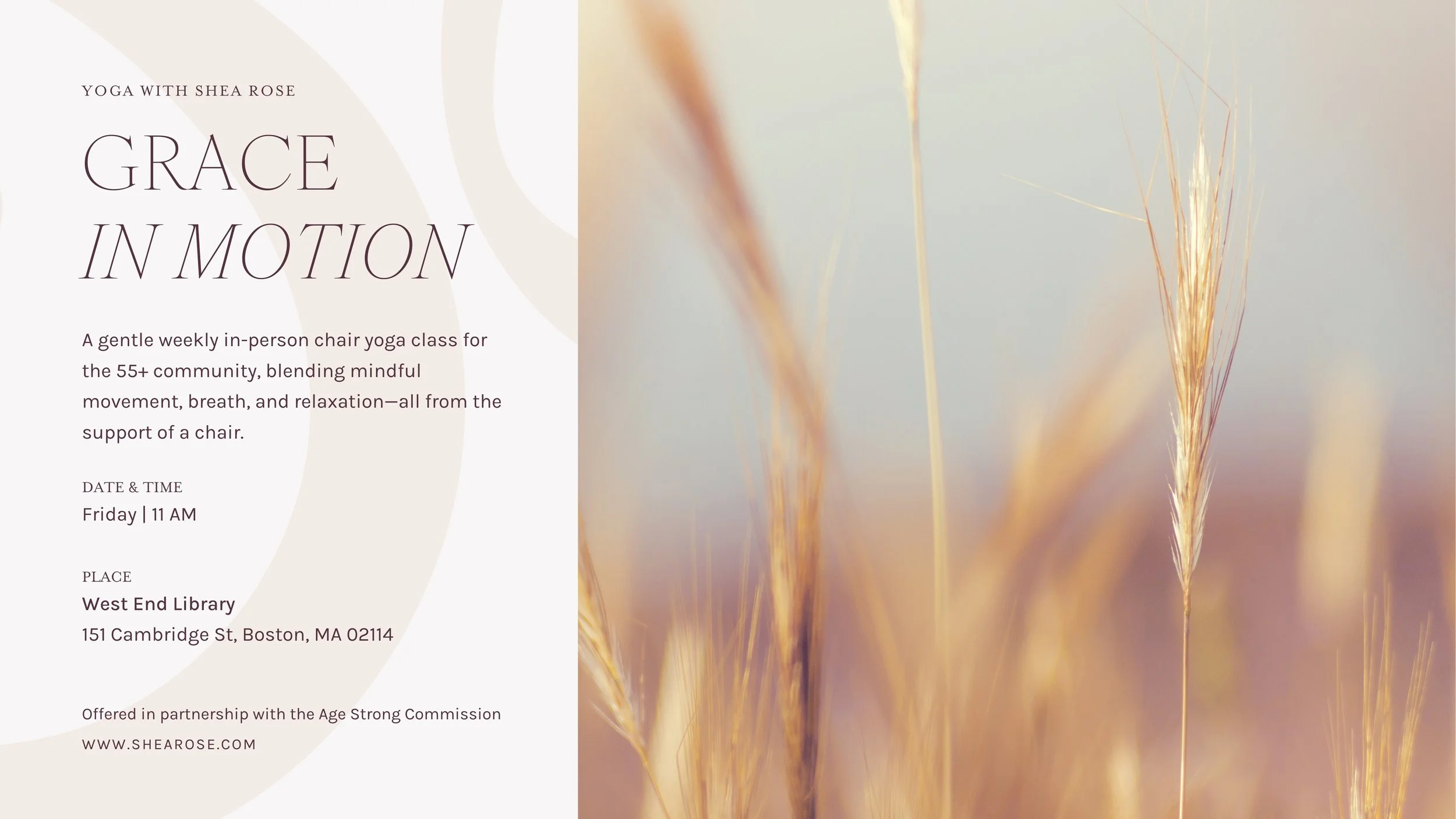 Grace In Motion Friday, January 30, 2026 11:00 AM Friday, June 26, 2026 12:00 PM West End Library 151 Cambridge Street Boston, MA, 02114 United States (map) Google Calendar ICS Grace In MotionA gentle weekly in-person chair yoga class for the 55+ community, blending mindful movement, breath, and relaxation—all from the support of a chair. • Back and hips• Neck and shoulders• Strength and flexibilityThis is a FREE event.