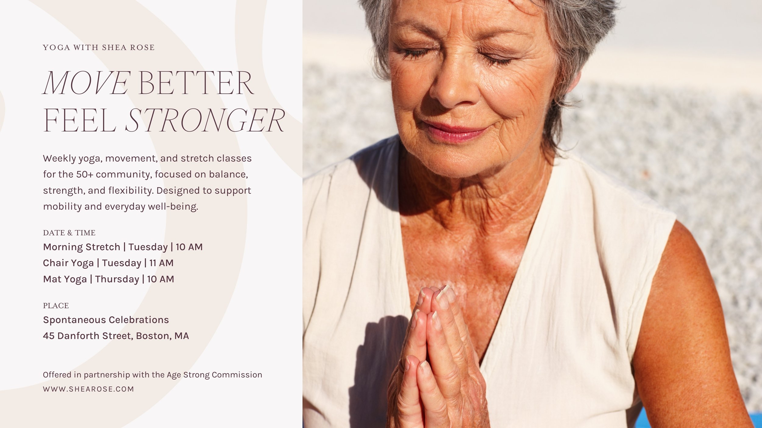 Weekly yoga, movement, and stretch classes for the 50+ community, focused on balance, strength, and flexibility. Designed to support mobility and everyday well-being.